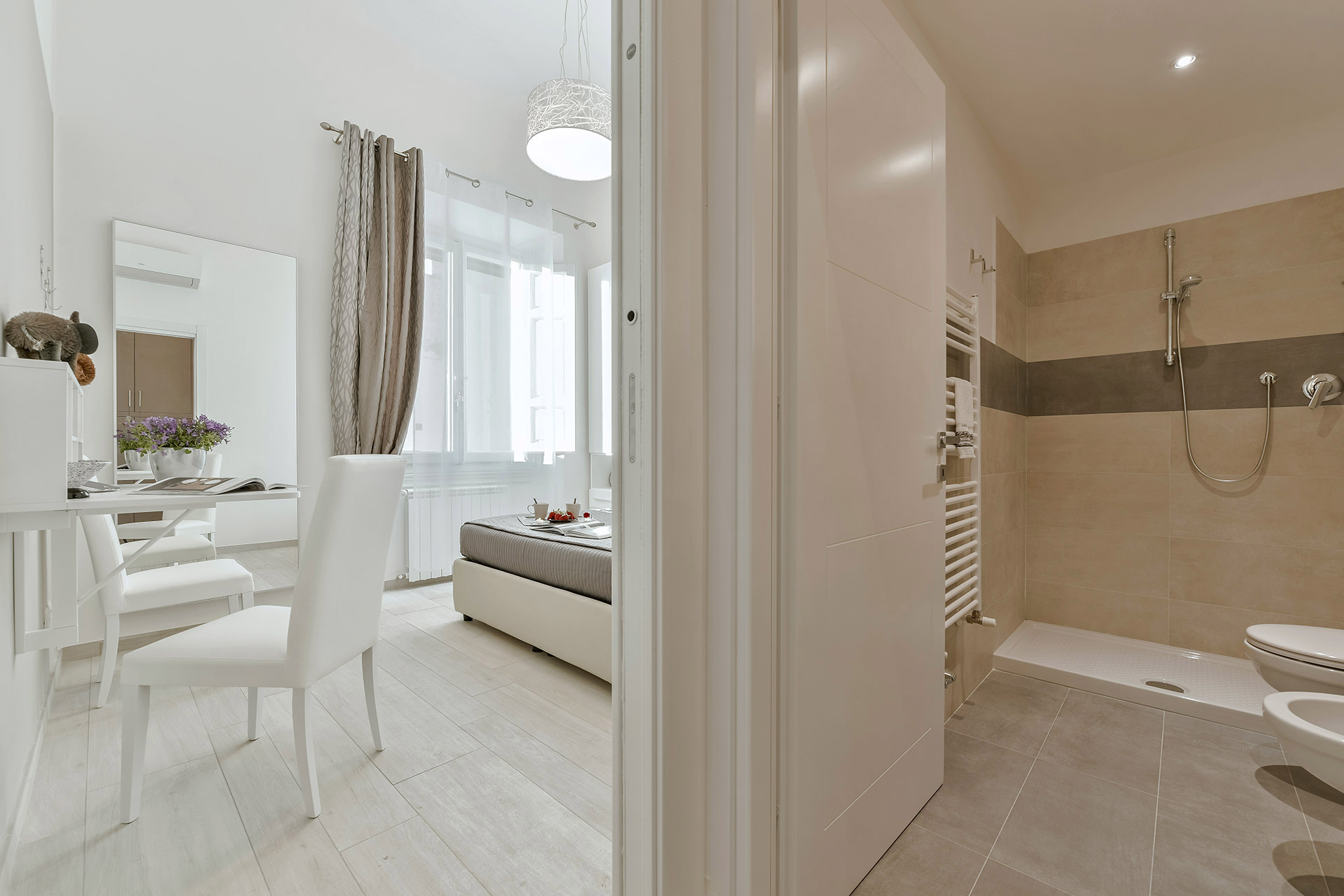 It is elegant, stylish and comfortable like a family home. Located on the third floor, with elevator, it has all kinds of amenities, is painted with soft and elegant colours and includes 2 bedrooms, 2 bathrooms and a well equipped kitchen. It can accomodate up to 6 people. Located in a central and quiet residential area, one step from the beautiful San Marco square, it represents an ideal solution for anybody wanting to have a sensorial experience of the elegance, art and good cuisine of Florence.